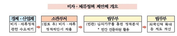 (플러스인뉴스) 법무부는 외국인력 정책에 국민의 공감대와 더불어 현장의 인력수요를 적극적으로 반영하기 위하여 9월 23일 경제·산업계·광역자치단체 등에서 제안한 비자·체류정책을 체계적으로 심의하는 제2차 '비자·체류정책 협의회'를 개최하여, 6개 제안을 수용했다. 이번 제2차 '비자·체류정책협의회'에서는, 7개 중앙부처 및 1개 지자체에서 총 16건의 제안을 제출받았으며, 협의회 안건 상정에 앞서 인력 수급 전망은 물론 현행 비자 제도와의 정합성 등 전문가의 자문을 거쳐 총 11건의 제안을 협의회에 상정했다. 협의회 심의 결과 ➊건설기계 (부품)제조원, 도축원 등 직종 신설, ➋이공계 석박사 유학생 인턴쉽 허용 요건 완화, ➌수출전문교육 수료 유학생 전문활동(E-7-1) 특례 신설 등 6건의 제안이 수용됐다. 한편, 외국인력 도입 필요성이 낮거나, 국민 일자리 보호, 외국인의 정착·적응 및 인권침해 방지 방안 등 마련이 불충분하다고 판단된 5개의 제안에 대해서는 보완 또는 불수용 결정을 했다. 상정된 안건은 단순 경제적 효과뿐 아니라 △국가 중장기 계획과의 정합성 △국민 고용에 미치는 영향 △이해관