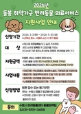 (플러스인뉴스) 수원특례시는 돌봄 취약가구의 반려동물 양육 부담을 덜고 동물복지를 강화하기 위해 ‘2026년 돌봄 취약가구 반려동물 의료서비스 지원사업’을 추진한다. 지원 대상은 수원시에 주민등록을 두고 실제 거주하며 본인 명의로 반려동물을 등록해 기르는 기준중위소득 85% 이하 가구다. 저소득층, 중증장애인, 한부모가정, 다문화가정, 1인가구 등이 포함된다. 경기도 공공입양기관에서 국가봉사동물을 입양한 경우는 소득과 관계없이 지원한다. 보호자 1명당 2마리까지 신청할 수 있다. 동일 동물은 ‘의료·돌봄·장례 지원’ 또는 ‘노령동물 종합건강검진’ 중 한 가지 항목만 선택해 지원한다. 의료·돌봄·장례 지원은 마리당 최대 16만 원(초과비용 자부담), 노령동물 종합건강검진은 최대 32만 원(초과비용 자부담)까지 지원한다. 노령동물 검진은 2019년 12월 31일 이전 출생한 반려동물에 한한다. 의료지원에는 백신접종, 중성화수술, 기본검진·치료비 등이 포함되고, 돌봄 위탁비와 장묘 서비스도 지원한다. 노령 반려동물은 종합건강검진을 받을 수 있으며 모든 서비스는 관내 업체를 이용해야 한다. 신