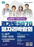 (플러스인뉴스) 경기도와 경기도일자리재단이 11월 20일 남양주체육문화센터에서 ‘경기도 5070 일자리박람회 in 남양주+구리’를 개최한다. ‘경기도 5070 일자리박람회’는 도내 중장년 구직자의 재취업을 지원하는 ‘경기 5070 그레잇잡투어(Gray it-job tour)’의 하나로 마련됐다. 남양주일자리센터, 남양주시니어클럽 등 지역 일자리 유관기관과 협력해 5070세대 구직자에게 맞춤형 취업 기회를 제공할 계획이다. 올해 7월 수원시를 시작으로 도내 31개 시군을 순회하며 도민의 접근성을 강화했으며, 채용 상담은 물론 경력 재설계 프로그램까지 종합적인 취업 지원 서비스를 제공하는 통합형 일자리 행사다. ‘남양주+구리 박람회’에는 서창산업(주), ㈜케이미트팜 등 도내 우수기업 30개사가 참여해 인사 담당자가 직접 현장 면접을 진행한다. 이외에도 40여 개사가 간접 채용 방식으로 이력서를 접수해 폭넓은 채용 기회를 마련한다. 행사장 내에는 ▲이력서·자기소개서 클리닉 ▲커리어 코칭 ▲재무 상담 ▲시니어 유망직업 체험 등 구직자의 취업 역량 강화를 위한 부대 프로그램도 함께 운영된다. 한