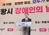 (플러스인뉴스) 의왕시는 4월 21일 국민체육센터에서 관내 장애인과 가족, 내빈 등 1,000여 명이 참석한 가운데 ‘제19회 의왕시 장애인의 날 기념행사’가 성황리에 개최됐다고 밝혔다. 희망나래장애인복지관 주관한 이날 행사는 장애인의 날을 맞아 ‘당연한 일상, 모두가 누릴 수 있도록’이라는 표어 아래, 장애인과 비장애인이 함께 소통하는 화합의 장을 마련하고 더불어 살아가는 사회 분위기 조성을 위해 추진됐다. 이날 행사는 식전 축하공연으로 △농아인협회 의왕시지회 수어공연 △퓨전 플루티스트 서가비의 공연이 펼쳐졌으며, 이어 (사)경기도 신체장애인복지회 의왕시지회 김재진, 이지나 씨의 장애인 인권헌장 낭독과 기념식, 유공자 표창 등이 진행됐다. 특히, 으뜸 장애인상에서는 ‘모범장애인 부문’에 안광례 씨, ‘장애인봉사 부문’에 황순규 씨가 각각 수상해 큰 박수를 받았다. 또한, 장애인복지 유공자 시상에서는 △박미애(농아인협회) △강경아(희망나래장애인복지관) △권희선(의왕장애아재활치료교육센터) △김희수(해온장애인보호작업장) △김수종(의왕시청 노인장애인과) △우채운(의왕시장애인주간보호시설) △오은해(희망나래