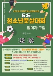 (플러스인뉴스) 강화군시설관리공단(이사장 박영길)에서 운영하는 청소년 문화의 집이 오는 15일~20일, 관내 중․고등 남학생을 대상으로 강화군 청소년 풋살대회 참가자(팀)를 모집한다고 밝혔다. 이번 대회는 오는 25일 강화공설운동장에서 개최되며, 참가팀은 최대 16팀(112명 이내)이다. 참가 신청은 온라인 접수(홍보 안내문 속 QR코드를 통해 접속 가능)로 진행되며, 중등부와 고등부 각 8팀씩 선착순 마감된다. 이날 참가 선수들은 예선전부터 준결승, 3․4위전, 결승에 이르는 토너먼트 방식의 경기를 통해 실력을 겨룰 예정이다. 대회에서는 우수한 성적을 거둔 1~3위 팀에 대한 시상과 공정한 경기 운영과 모범적인 태도를 보여준 팀에게 페어플레이상도 수여된다. 청소년 문화의 집 관계자는 “이번 대회를 통해 청소년들이 건강한 생활 습관을 형성하고, 스포츠를 통해 협력과 규칙 준수의 중요성을 배우며 올바른 자질을 함양할 수 있는 좋은 기회가 될 것이다”고 밝혔다. 강화군 청소년 풋살대회와 관련한 자세한 사항은 강화군시설관리공단 홈페이지를 참고하거나 청소년 문화의 집으로 문의하면