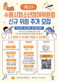 (플러스인뉴스) 수원시청소년청년재단(이사장 최종진)은 수원시 청소년의 정책 참여 확대와 권익 증진을 위해 '제22기 수원시청소년참여위원회' 위원을 추가 모집한다고 밝혔다. 수원시청소년참여위원회는 청소년기본법5조의2(청소년자치권의 확대)에 따라 청소년이 직접 정책 제안과 의견 개진에 참여하며 청소년 정책의 실효성을 높이기 위해 운영되는 공식 참여기구이다. 이번 추가 모집은 수원시에 거주하는 9세부터 24세까지의 청소년을 대상으로 하며 총 20명 내외를 선발할 예정이다. 활동 기간은 2026년 3월부터 12월까지이며 주요 활동 내용은 △수원시 청소년 정책 제안‧발굴 및 자문 △정책 관련 전문교육 참여 △청소년축제 기획 및 운영 △경기도 청소년참여위원회 및 관내 참여기구 교류 활동 등이다. 참여위원회 위원에게는 수원시장 명의의 위촉장이 수여되며 활동에 따라 봉사시간도 부여된다. 모집 기간은 2026년 2월 13일부터 2월 24일까지이며 신청은 재단 홈페이지 또는 수원시청소년청년재단 경영지원실로 문의하면 된다. [뉴스출처 : 수원시청소년청년재단]