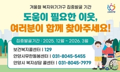 (플러스인뉴스) 안양시는 한파와 지속된 경기 침체에 대응해 오는 3월까지 복지서비스 접근이 어려운 취약계층을 적극 발굴하고 지원하는 ‘겨울철 복지위기가구 집중 발굴 기간’을 운영한다고 6일 밝혔다. 이번 집중 발굴은 단전·단수, 실직, 휴폐업 등과 같은 위기 징후가 있는 가구, 고독사 위험이 높은 1인 가구, 저소득 장애인 가구 등이 대상이며, 위기가구를 선제적으로 찾아내고 실질적인 지원을 연계하는 데에 중점을 두고 있다. 시는 안양시무한돌봄센터, 안양시복지콜센터, 각 동 행정복지센터는 물론 명예사회복지공무원, 삼천리 등 민간 협력기관 등과 함께 위기가구를 발굴할 계획이다. 발굴된 위기가구에는 긴급복지 및 기초생활보장제도의 공적서비스를 통한 생계비 및 주거지원, 일상돌봄 지원 등의 맞춤형 복지서비스를 신속하게 제공하고 어려움이 해소될 때까지 사례관리할 계획이다. 특히, 독거노인 등 취약 어르신에게 노인맞춤형돌봄서비스를 안내 및 지원하고, 응급안전안심장비 및 고령자스마트 안심서비스 설치 등을 연계할 계획이다. 시 관계자는 “겨울철은 한파 등으로 대외 활동이 줄어들면서 고립되거나 생계 어려