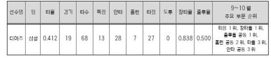 (플러스인뉴스) 삼성 디아즈가 2025 신한 SOL뱅크 KBO 리그 9~10월 월간 MVP로 선정됐다. 디아즈의 개인 첫 월간 MVP 수상이자, 삼성 외국인 타자로서는 첫 수상이다. 디아즈는 기자단 투표 총 35표 중 30표(85.7%), 팬 투표 53만 365표 중 28만 6, 323표(54%)로 총점 69.85점을 받아, 기자단 투표 0표, 팬 투표 7만 8, 353표로 총점 7.39점을 기록한 LG 오스틴을 제쳤다. 9~10월의 디아즈 성적은 타율 0.412(3위), 7홈런(공동 2위), 28안타(공동 3위), 27타점(1위), 장타율 0,838(1위), 출루율 0.500(공동 1위) 등 대부분의 공격 지표에서 상위권에 이름을 올렸다. 특히 9월 25일 대구 키움 전에서 기록한 홈런으로 단일시즌 최다 타점 신기록(147타점)과 외국인타자 최다 홈런 신기록(49홈런)을 동시에 경신하며 KBO 리그의 새 역사를 써내려 갔다. 2025시즌 마지막 월간 MVP에 선정된 디아즈는 화려한 성적으로 정규시즌을 마무리했다. 50홈런, 158타점, 장타율 0.518로 세 부문에서 시즌 1위에 오르며, KBO 시상식에서 3