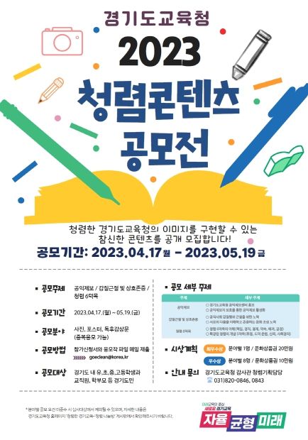 도교육청 정진민 감사관은 “현장의 다양하고 참신한 아이디어가 모여 청렴 가치를 확산할 수 있는 작품이 나오길 기대한다”며 “앞으로도 경기교육 구성원이 청렴 가치를 공유하고 실천할 수 있도록 청렴 문화 확산에 앞장 서겠다”고 말했다.