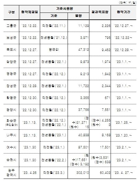 광주광역시 이전에 절수협약을 체결한 전남지역 12개 시군은 올해 1월부터 3개월간 총 184만톤의 수돗물을 절감하여 약 1억 2,900만 원의 수도요금을 감면받았다.