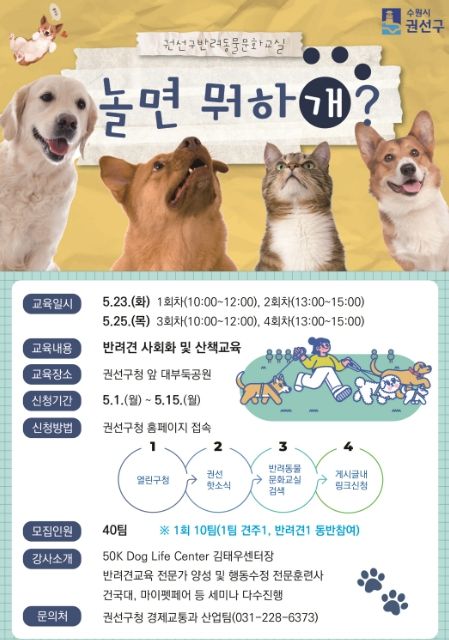 이번 행사는 반려동물을 등록한 권선구 주민을 대상으로 총 4회차에 걸쳐 1회차당 10팀으로 진행된다. 참가신청은 권선구청 홈페이지‘권선핫소식’에서 5월 15일까지 신청할 수 있으며 교육신청은 선착순 모집에 따라 조기 마감될 수 있다.
