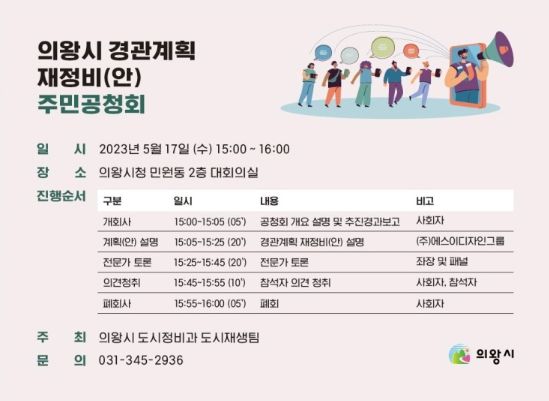 이번 공청회에서는 ▲의왕시 경관계획의 재정비(안) 기본계획 ▲경관권역·축·거점 및 중점경관관리구역 계획 ▲주요 시행계획 ▲가이드라인 기본구상 등에 대해 상세히 설명하고, 분야별 전문가 토론과 질의응답이 진행될 예정이다. 이 가운데 시민에게 직접적인 영향을 미칠 수 있는 중점경관관리구역의 범위 및 기준에 대한 재설정 사항과 경관사업, 경관협정 내용에 대해 심도 있게 논의하고 경관조례 개정, 경관심의 대상 기준 변경 사항에 대해 시민들에게 공유하고 의견을 수렴할 예정이다