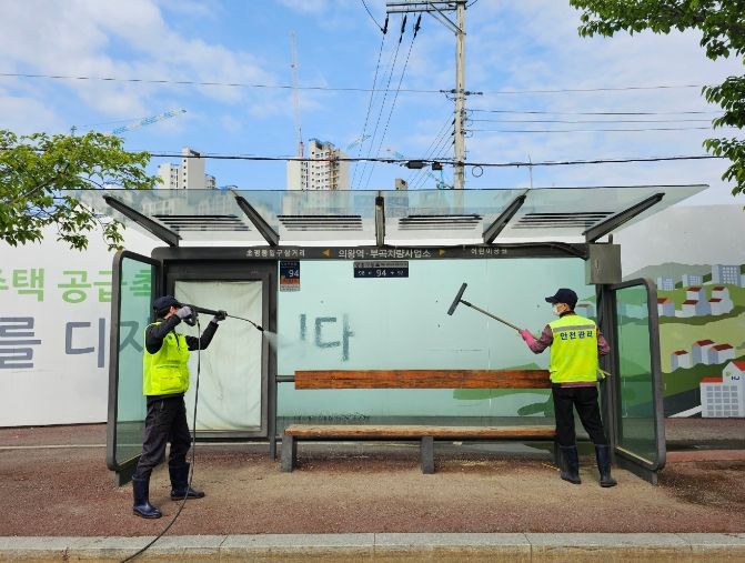 의왕시는 쾌적하고 안락한 버스정류장 환경조성을 위해 겨울철 염화칼슘과 봄철 황사 등으로 오염된 버스정류장을 고압세척기를 이용해 오염물질을 세척하고 세정제를 살포하여 잔여물질과 불법광고물 등을 제거할 계획이다.