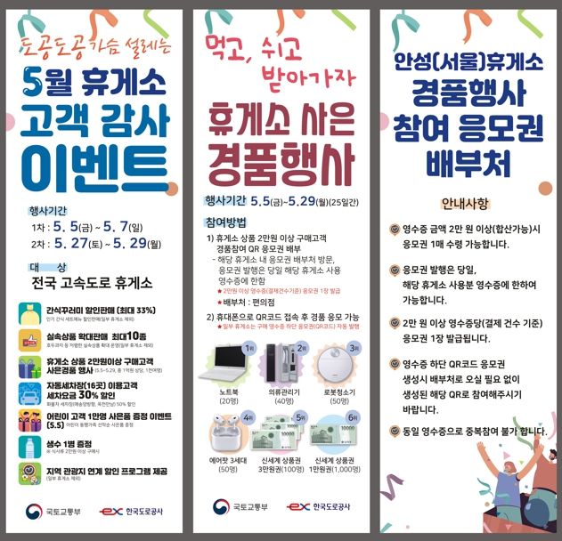(플러스인뉴스) 한국도로공사 수도권본부 수원지사 안성(서울방향)휴게소는 5월 가정의 달을 내수활성화 기간으로 정하고, 특히 5월5일(금)~5월7일(일)과 5월26일(금)~5월28일(일)까지 6일간 어린이날과 석가탄신일을 맞아 다채로운 이벤트를 실시할 예정이다.