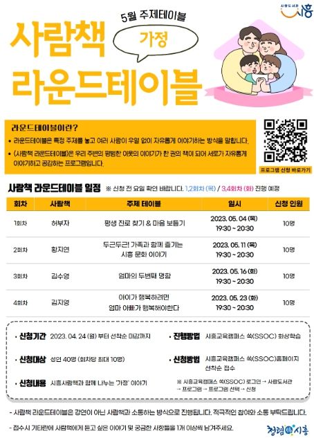 (플러스인뉴스) 시흥시는 가정의 달 특집으로 ‘가정’을 주제로 한 ‘5월 사람책 라운드테이블’을 오는 4일부터 시흥시중앙도서관에서 운영한다. 이를 통해 가족 구성원들이 개인 또는 함께 즐길 수 있는 다채로운 사람책 이야기를 준비했다.