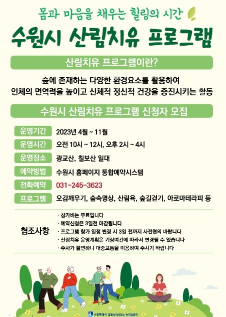 수원시 관계자는 “최근 산림이 여가 활동, 치유의 장으로 역할이 다변화되고 있다”며 “수원시 최초로 산림치유프로그램을 시작하는 만큼 치유가 필요한 시민에게 숲이 치유와 안식의 공간이 될 수 있도록 노력하겠다”고 밝혔다.