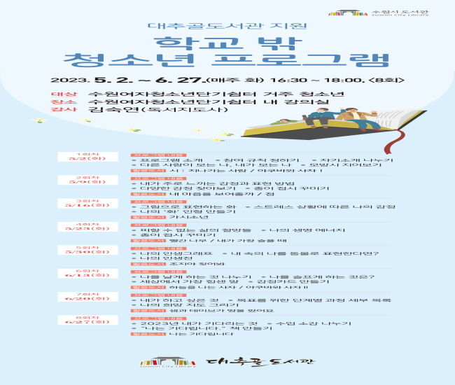 5월 2일부터 6월 27일까지 매주 화요일 수원여자단기청소년 쉼터 강의실에서 쉼터 거주 청소년들 대상으로 김숙연 독서지도사가 프로그램을 진행한다.