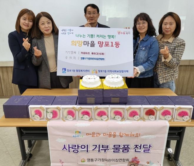 영통구가정어린이집연합회는 어버이날을 맞이하여 사랑을 듬뿍 담은 카네이션 모양의 수세미와 귀여운 모양의 케이크를 망포1동 행정복지센터에 기부했다. 이렇게 전달받은 물품은 기초생활수급 홀몸어르신 10명에게 전달됐다.