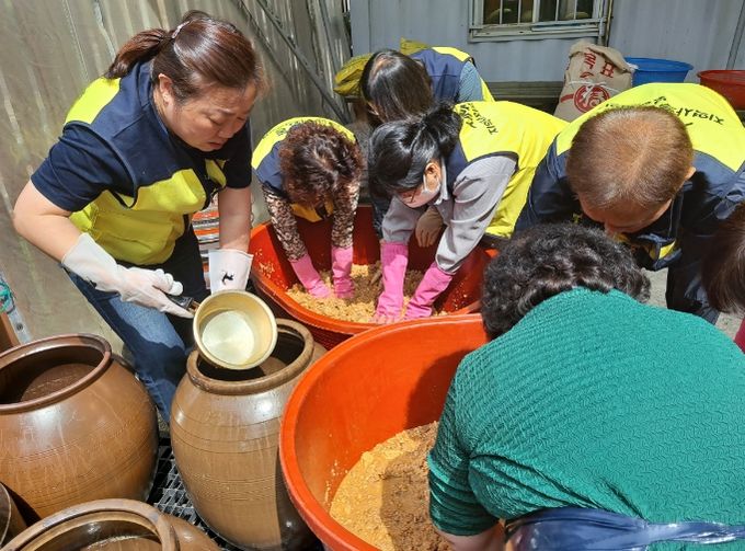 이날 작업은 지난 3월 1차 작업 이후 진행된 2차 작업으로 지역사회보장협의체 위원들은 장독의 메주를 건져 간장을 분리하고 건진 메주에 메주가루와 고추씨가루 등을 섞어 된장을 만들었다.