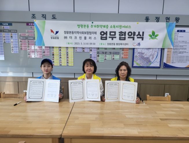 (플러스인뉴스) 정왕본동 지역사회보장협의체가 지난 3일 ㈜더크린플러스와 정왕본동 행정복지센터에서 지역사회보장협의체 특화사업인 ‘소독지원 서비스’ 업무협약을 맺었다.