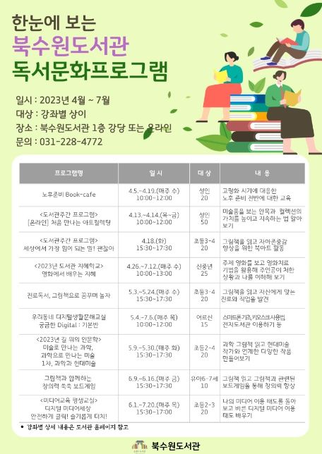 북수원도서관 관계자는 “길 위의 인문학·도서관 지혜학교·미디어교육 평생교실 등 여러 공모사업에 적극적으로 참여해 선정되고, 생애주기별 독서문화프로그램을 운영해 평생학습 기관으로서 역할을 충실히 하고 있다”며 “시민들이 도서관에서 다양한 독서문화프로그램에 참여하며 재충전하길 바란다”고 말했다.