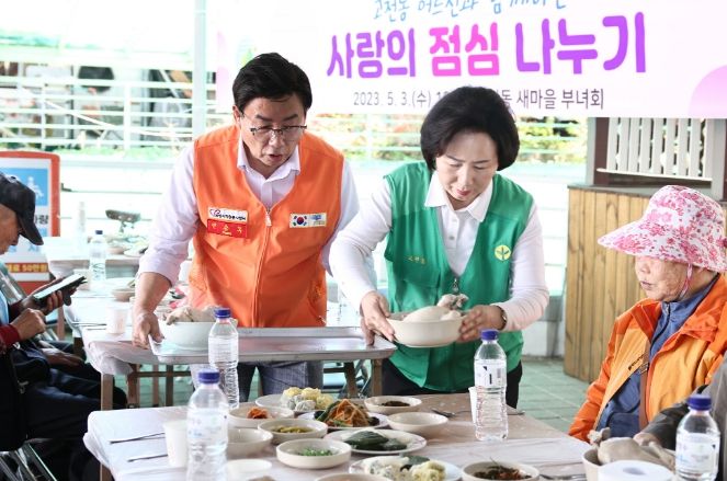 (플러스인뉴스) 의왕시 고천동 새마을부녀회는 5월 3일 취약계층 어르신 30여 명을 초청해 고천동주민센터 1층 앞마당에서 점심을 제공했다.