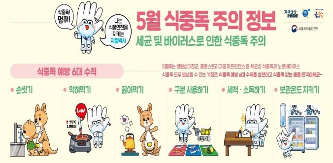 더하여 식중독 예방 6대 수칙인 ▲손씻기 ▲ 익혀먹기▲끓여먹기 ▲구분 사용하기▲세척·소독하기 ▲보관온도 지키기 실천을 통해 식중독을 예방할 수 있다.