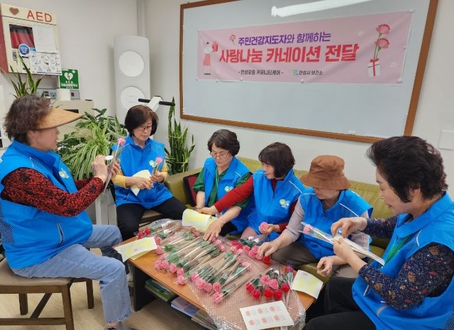 보건소가 양성한 삼죽면·보건진료소 주민건강지도자 62명이 제각기 모여 카네이션을 만들고 마을의 독거 및 만성질환 노인 600여 명을 방문해 전달하며 이를 통해 돌봄 대상자에 정서적 지지는 물론 지역사회에서의 이웃 돌봄 분위기를 확산시키고자 마련했다.