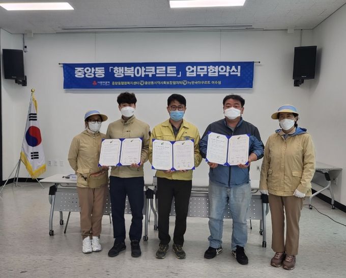 (플러스인뉴스) 중앙동 지역사회보장협의체는 hy한국야쿠르트 여주점과 작년에 이어 19일 중앙동행정복지센터 2층 회의실에서 어르신 안부 확인'행복야쿠르트'협약식을 체결하였다.