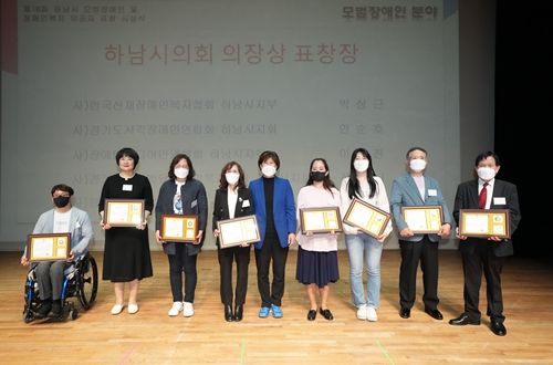 수상자 명단은 ▲사)경기도지적발달장애인복지협회 하남시지부 장하나 직원 ▲사)경기도시각장애인연합회 하남시지회 안순호 수석부회장 ▲하남시수어통역센터 김현주 수어통역사 ▲사)한국장애인정보화협회 경기도협회 하남시지회 조순덕 회원 ▲사)경기도장애인복지회 하남시지부 김보라 합창단원 ▲사)장애인미디어인권협회 하남시지회 이연진 회원 ▲사)한국장애인부모회 하남시지부 강경임 이사 ▲사)한국산재장애인복지협회 하남시지부 박상근 이사 ▲하남시장애인후원회 허재혁 이사 등이다.