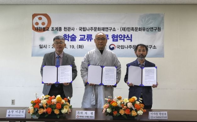(플러스인뉴스) 문화재청 국립문화재연구원 국립나주문화재연구소는 19일 오후 3시 국립나주문화재연구소 회의실에서 대한불교 조계종 천관사(주지스님 지행), (재)민족문화유산연구원과 함께 전남 장흥 천관사와 관련한 불교 문화유산에 대한 체계적인 조사·연구, 홍보 활성화를 위한 업무협약을 체결했다.