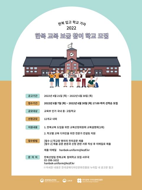 (플러스인뉴스) 문화체육관광부는 교육부와 함께 4월 21일(목)부터 6월 30일(목)까지 ‘한복교복 보급사업’에 참여할 중·고등학교 12개교를 공모한다.
