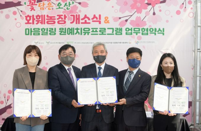 이번 업무협약을 통해 오산시와 4개 기관(오산지역자활센터, (주)그리니쉬 농업회사법인, 오산시건강가정․다문화가족지원센터, 오산시정신건강복지센터)은 긴밀한 민․관 협력체계를 구축하여 주민의 마음건강 지원을 위한 원예치유․체험 교육 프로그램을 제공할 예정으로,
