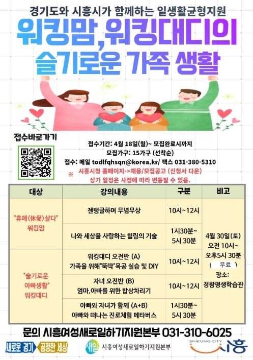 이번 ‘슬기로운 가족생활’ 프로그램은 4월 30일 오전 10시부터 시흥시 정왕평생학습관에서 진행되며 관내 초등학교 고학년 자녀를 둔 맞벌이 가정이 우선적으로 지원된다.