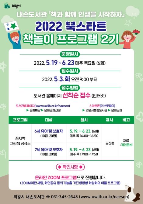 비대면 온라인(ZOOM)으로 진행되는 이번 프로그램의 수강료는 무료이며, 프로그램과 관련한 자세한 내용은 의왕시 내손도서관팀으로 문의하면 된다.