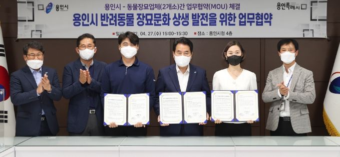 (플러스인뉴스) 용인시는 27일 시장 접견실에서 관내 동물장묘업체 2곳과 ‘반려동물 장묘문화 상생 발전 업무 협약’을 체결했다.