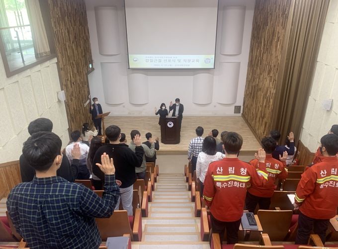 (플러스인뉴스) 동부지방산림청은 4월 25일 전 직원을 대상으로 갑질 근절 선포식과 교육을 실시했다. 이번 갑질 근절 선포식과 교육은 공공분야 갑질을 근절하고 직원 간 상호 존중하는 공직문화 조성으로 행복한 일터 및 삶터를 만들어가고자 마련되었다.