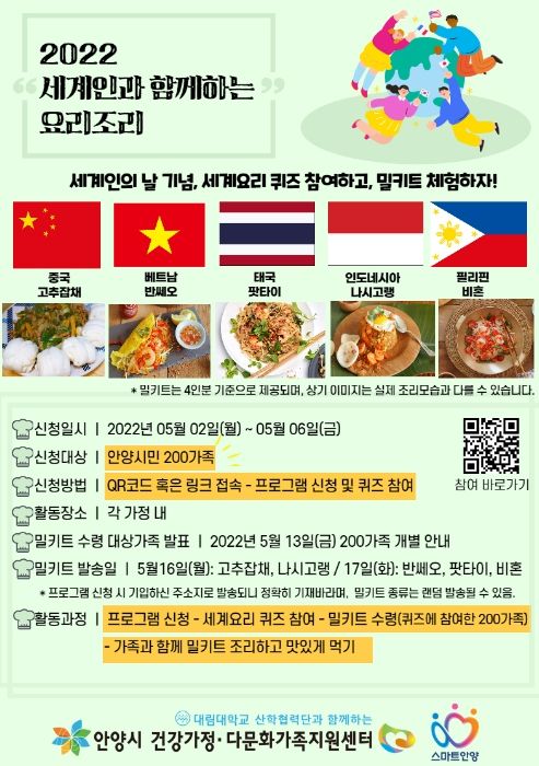 (플러스인뉴스) 안양시 건강가정·다문화가족지원센터는 세계인의 날(5월 20일)을 맞아 안양시민을 대상으로 ‘세계인과 함께하는 각국 요리체험 - 요리조리’, ‘세계인의 날 기념 인식개선 캠페인 – 세계문화 퀴즈’등을 5월 2일부터 5월 20일까지 비대면으로 진행한다.