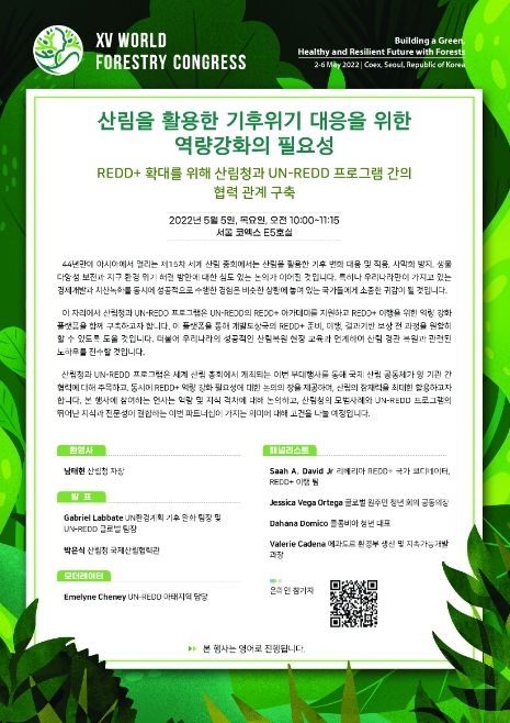부대행사에서는 유엔환경계획의 가브리엘 라바트(Gabriel Labbate) 팀장이 "준 국가 수준의 레드플러스(REDD+)의 성공요인과 잠재력; 산림의 기후위기 역량을 극대화하기 위한 역량강화의 필요성”을 주제로 발표하고, 박은식 국제산림협력관이 "한국의 성공적인 산림녹화 경험을 바탕으로 한 레드플러스(REDD+) 역량강화”를 주제로 발표한다.