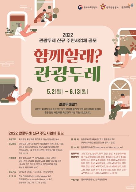 (플러스인뉴스) 문화체육관광부는 한국관광공사와 함께 주민들이 지속 가능한 지역관광 생태계를 만들어갈 수 있도록 5월 2일(월)부터 6월 13일(월) 오후 2시까지 ‘2022년 관광두레 신규 주민사업체’를 모집한다.