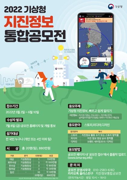이번 공모전 주제는 ‘지진정보, 빠르고 쉽게 알리기’로 대한민국 국민 누구나 참여할 수 있으며, 공모전 누리집을 통해 접수할 수 있다.