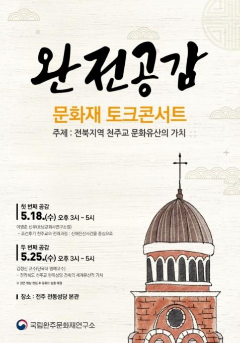 (플러스인뉴스) 문화재청 국립문화재연구원 국립완주문화재연구소는 지역민과 문화유산에 대해 소통하고 공감대를 형성하고자 5월 18일과 25일 오후 3시 전주 전동성당에서 ‘완전공감’ 문화재 대담(토크 콘서트)을 개최한다.