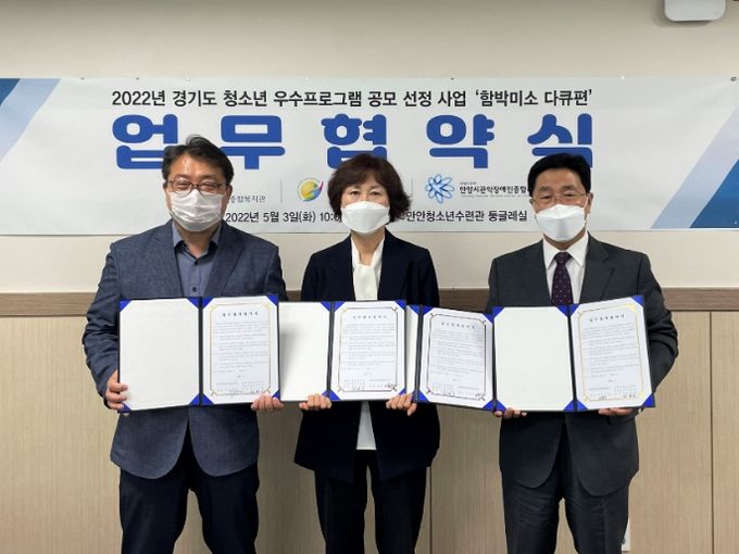 (플러스인뉴스) 안양시청소년재단 산하 만안청소년수련관과 안양시수리장애인종합복지관, 안양시관악장애인종합복지관은 지난 3일 장애인식개선 사회참여 프로그램 ‘함박미소 다큐편’의 성공적인 프로그램 운영을 위한 업무 협약을 체결했다.