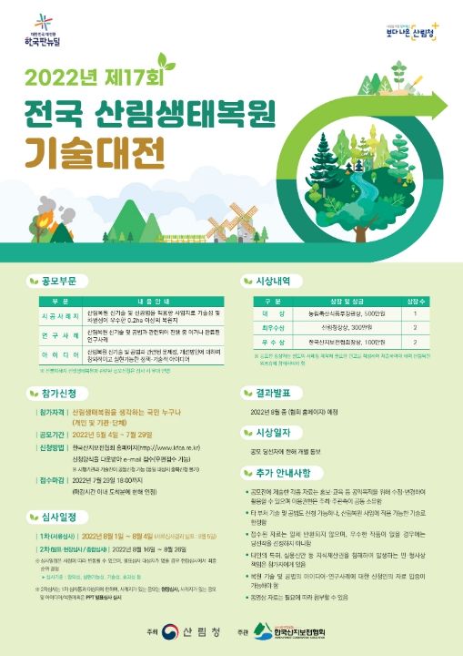 국민 누구나 참여 가능하며, 산림청 및 한국산지보전협회 누리집에서 신청양식을 내려 받아 2022. 7. 29. 까지 전자우편 또는 우편으로 접수하면 된다.