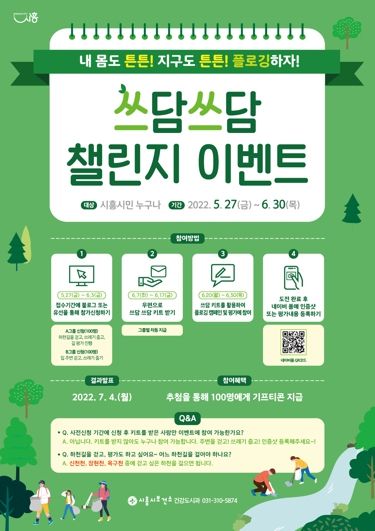 또, 사전 신청 기간에 신청하지 않아도 누구나 참여가 가능하며, 6월 1일부터 시흥시보건소 1층에서 이벤트 참여 시 사용할 수 있는 생분해 쓰레기봉투를 무료로 받을 수 있다.