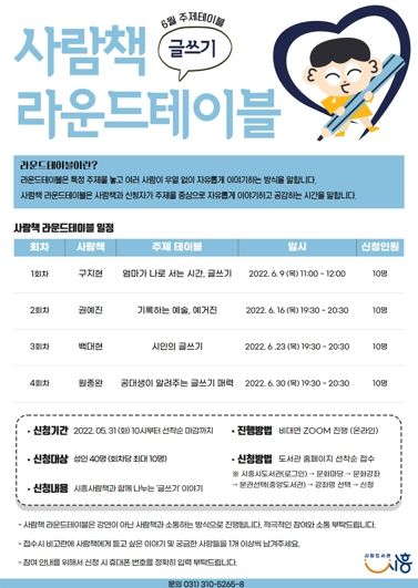 (플러스인뉴스) 시흥시가 자신의 경험과 재능을 이야기로 나누는 사람책 열람의 기회를 제공하는'사람책 라운드 테이블'이 6월에는 '글쓰기'를 주제로 시민들을 만난다.