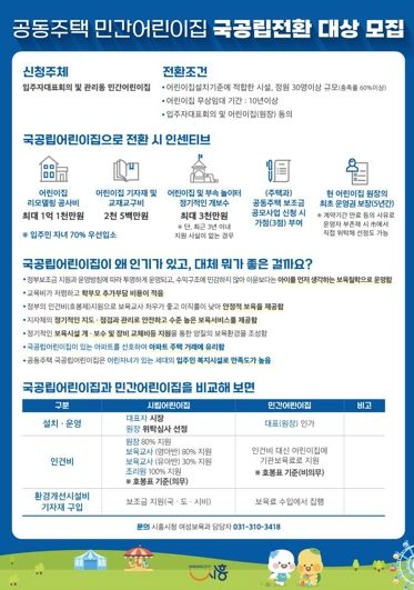 시는 현재 공동주택 내 민간어린이집 ‘국공립 전환’ 대상자를 모집 중에 있으며, 보다 자세한 내용은 시흥시청 홈페이지에서 확인하거나 여성보육과 보육정책팀으로 문의하면 된다.