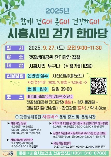 (플러스인뉴스) 시흥시는 시민의 건강한 생활 습관 확산과 활기찬 지역 공동체 조성을 위해 오는 9월 27일 오전 9시, 갯골생태공원 잔디광장에서 ‘2025년 제3회 시흥시민 걷기 한마당’을 개최한다.