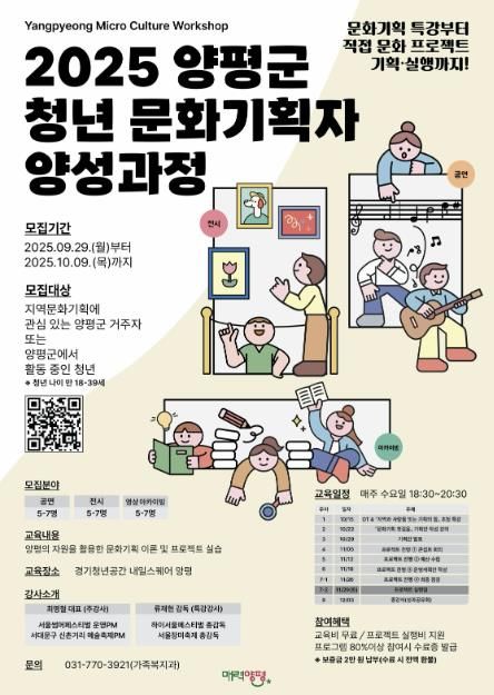 (플러스인뉴스) 양평군은 청년들의 문화·예술 기획 역량 강화를 통해 지역사회 문화 활성화와 청년 일자리 창출을 지원하고자 ‘2025년 양평군 청년 문화기획자 양성과정’을 10월부터 12월까지 운영한다고 밝혔다.