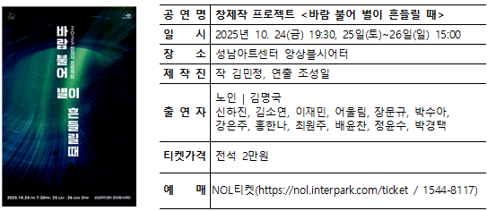 창제작 연극 ‘바람 불어 별이 흔들릴 때’는 성남아트센터 앙상블시어터에서 10월 24일(금) 오후 7시 30분, 25일(토)~26일(일) 오후 3시, 총 3회 공연된다. 티켓은 성남아트센터 홈페이지(www.snart.or.kr)와 NOL티켓(https://nol.interpark.com/ticket)을 통해 온라인 또는 전화로 예매가 가능하다. 전석 2만 원. 티켓 예매 및 공연에 대한 자세한 사항은 성남문화재단 고객센터(031-783-8000) 및 홈페이지를 통해 확인할 수 있다.