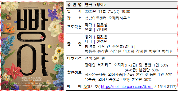 윤정국 성남문화재단 대표이사는 “연극 ‘빵야’는 묵직한 역사적 소재를 유머와 인간적인 이야기로 풀어내며, 오늘의 우리에게 역사와 기억의 의미를 되새기게 한다”며 “이번 공연이 드라마와 예능으로 역사를 쉽게 소비하는 시대에 깊은 울림과 진정한 성찰을 전할 것으로 기대한다”고 밝혔다.