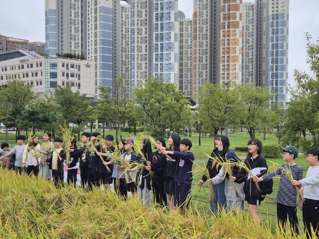 도시농업공원 다랑논의 벼 수확 체험은 지난 2013년부터 매년 추진되고 있다. 참여 학생들은 시흥시 햇토미(추청벼)를 직접 심고, 미꾸라지 방사 등 친환경 벼 재배 과정을 함께하며 파종부터 추수까지 1년간의 농사 과정을 체험한다.