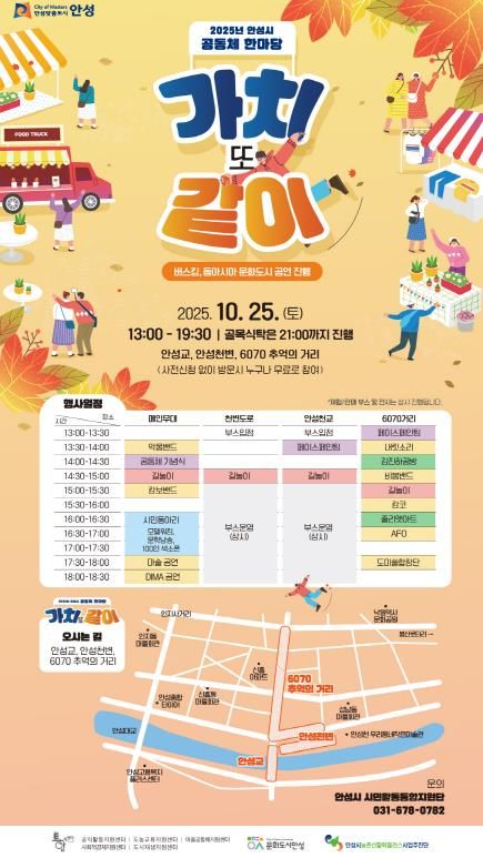 (플러스인뉴스) 안성시는 오는 2025년 10월 25일, 안성시내 일원(안성교~안성천변~안성천~6070 추억의거리)에서 2025 안성시 공동체 한마당 ‘가치 또 같이’ 를 개최한다.