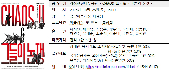 성남문화재단(대표이사 윤정국)은 ‘(재)예술경영지원센터 2025 공연예술 지역 유통지원사업 선정작’으로 최상철현대무용단의 ‘CHAOS Ⅱ’와 ‘그들의 논쟁’을 오는 10월 25일(토) 오후 3시 성남아트리움 대극장에서 선보인다.